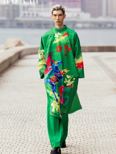 Không thể thiếu đi tà áo dài. Một trang phục gần như luôn xuất hiện trong mỗi BST mượn chất liệu truyền thống, nhưng thương hiệu vẫn có thể diễn giải mới cách hiểu về áo dài. Bộ đôi NTK sử dụng ngôn ngữ đương đại bằng cách ứng dụng chất liệu gấm, organza, cách phối quần nhung thời thượng và phom dáng oversize.