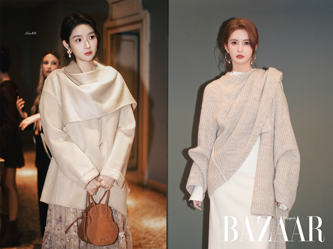 Chiếc áo choàng kết hợp dáng như khăn quàng, chế tác từ chất liệu len lạc đà thượng hạng, đầy trữ tình mà trang nhã. Đường cắt tối giản, phom dáng phóng khoáng gợi nhớ đến tinh thần effortless chic, thanh lịch mà vẫn tự do.