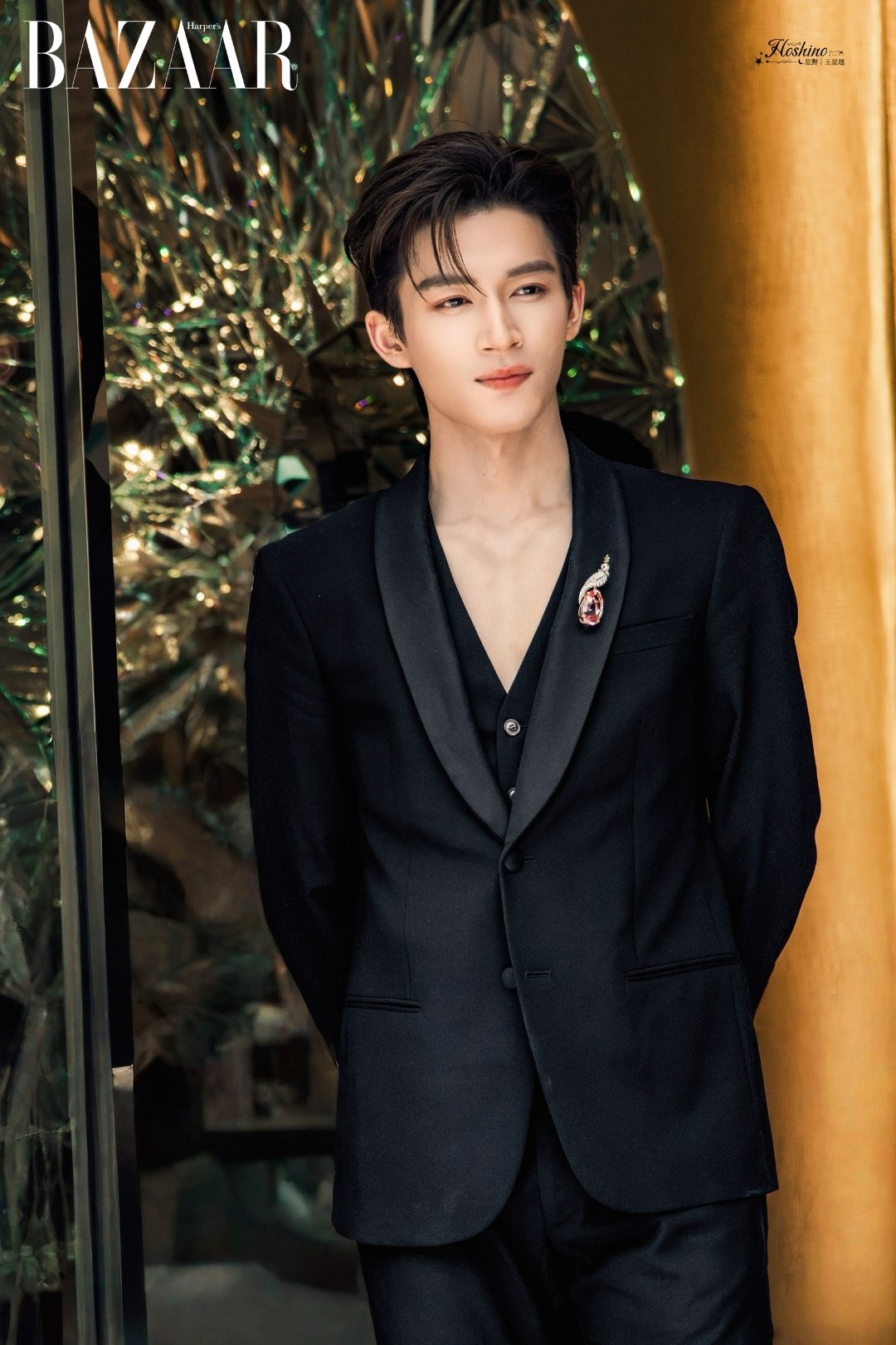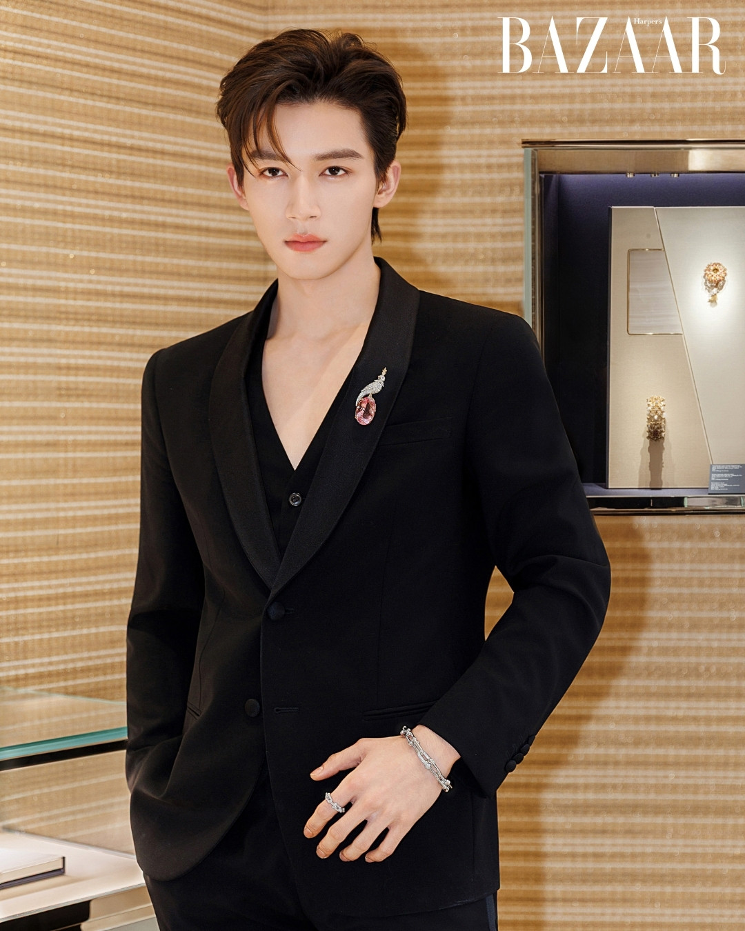 Nam diễn viên diện bộ suit đen tuyền với chiếc áo cổ xẻ sâu, tạo hiệu ứng gợi cảm hơn so với việc mặc vest ngoài áo sơ-mi thông thường. Trên ve áo vest, anh cài ghim cài áo Bird on a Rock kinh điển của Tiffany & Co. Trên tay là set vòng tay và nhẫn HardWear nạm kim cương.