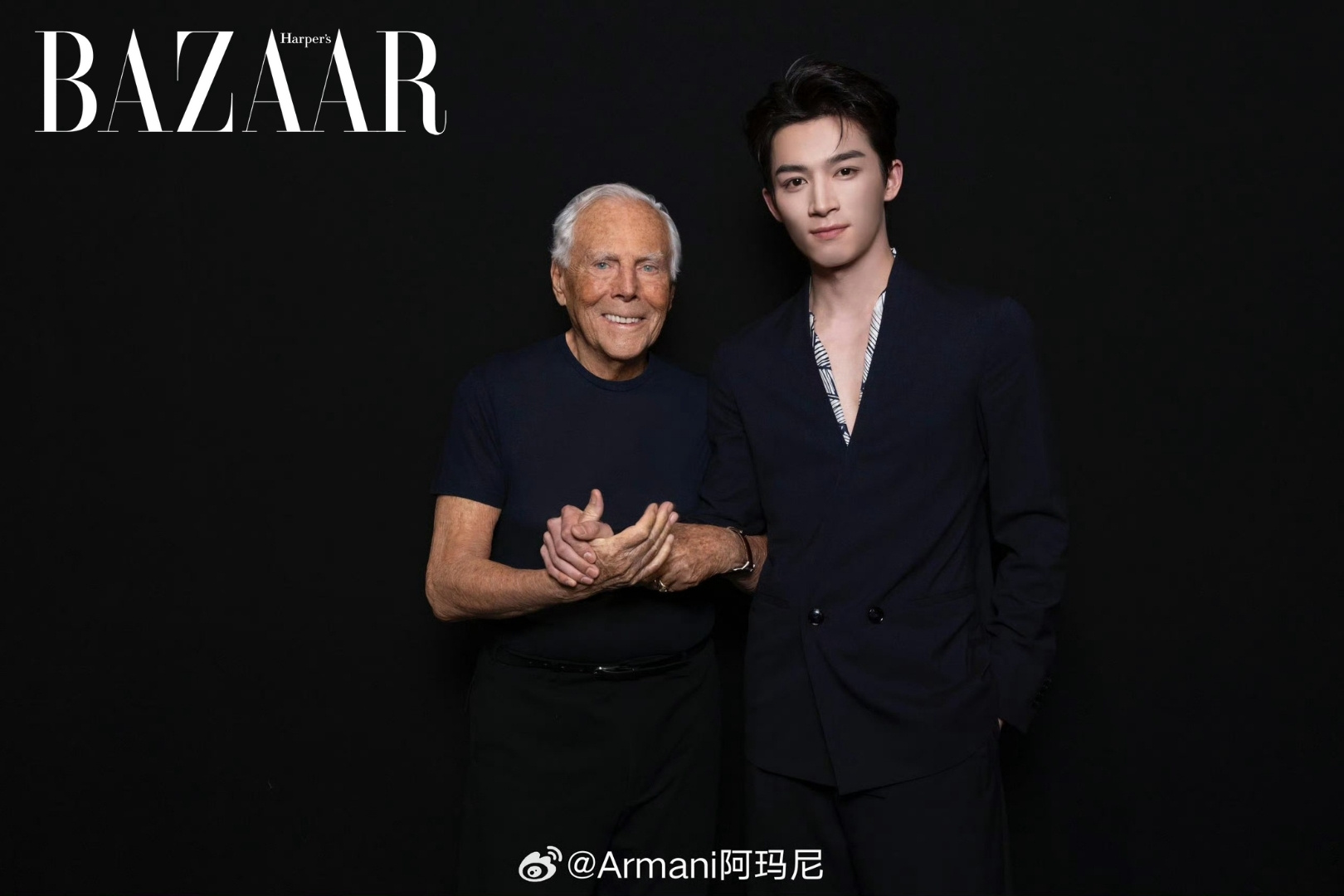 Vương Tinh Việt chụp ảnh kỷ niệm cùng nhà thiết kế thời trang gạo cội Giorgio Armani. Ảnh: Weibo Giorgio Armani