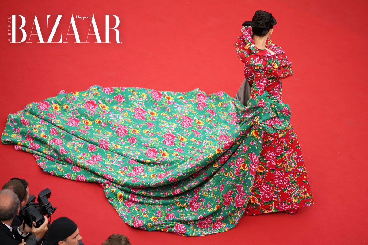 Trương Hinh Dư diện hoạ tiết chăn con công trên thảm đỏ Liên hoan phim Cannnes lần thứ 68. Ảnh: Getty Images
