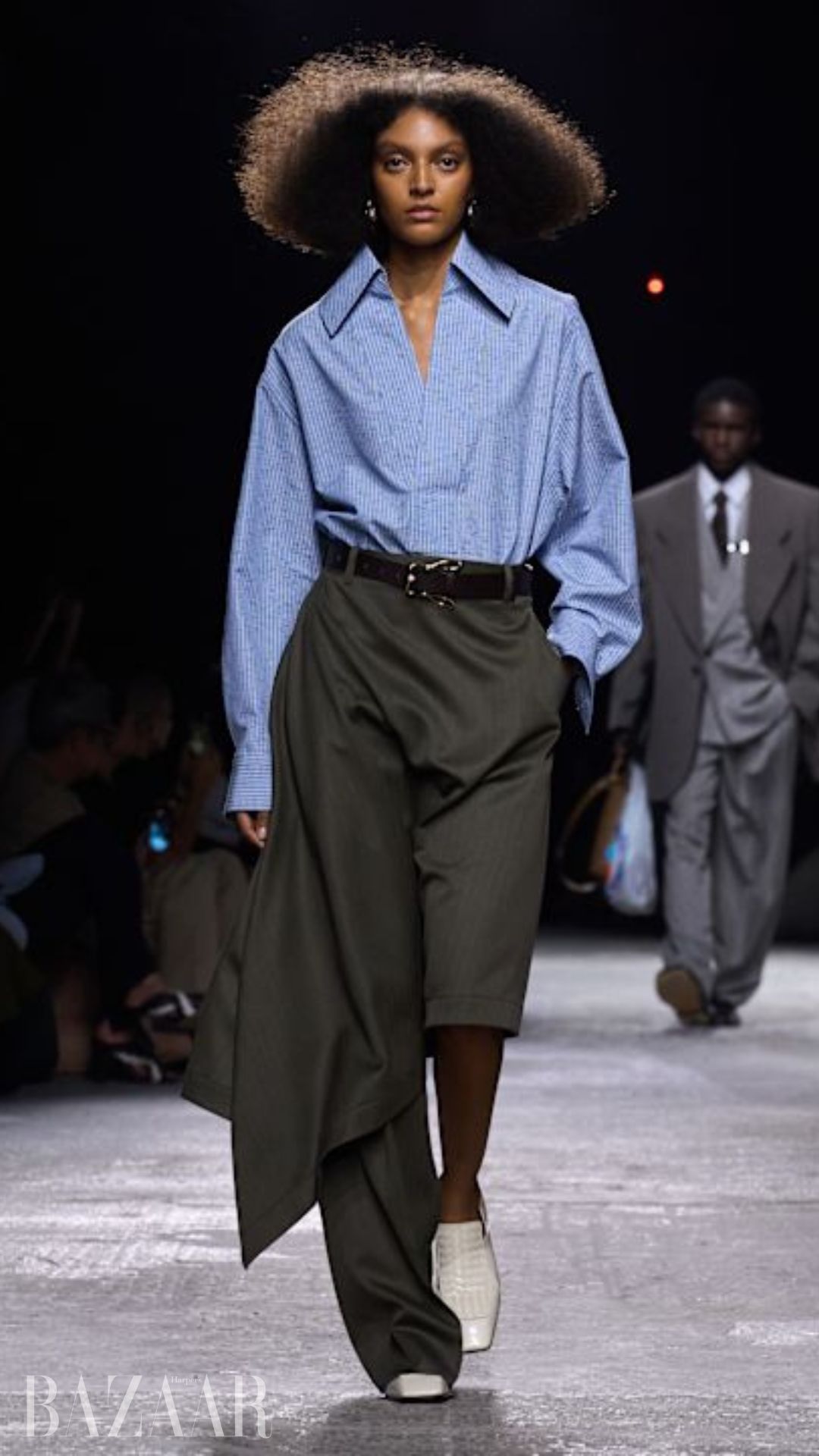 Phiên bản quần một ống trong mùa thời trang năm nay là sự phát triển từ các xu hướng corpcore và office siren, vốn xuất hiện vào cuối năm ngoái và được thấy cả tại Prada và Fendi cho bộ sưu tập Thu Đông 2024. Mùa Xuân/Hè 2025 đưa kiểu dáng công sở này tiến xa hơn một bước, phản ánh tâm trạng kín đáo hơn cho mùa này (Boss đặt tên cho show diễn của họ là ‘out of office’).