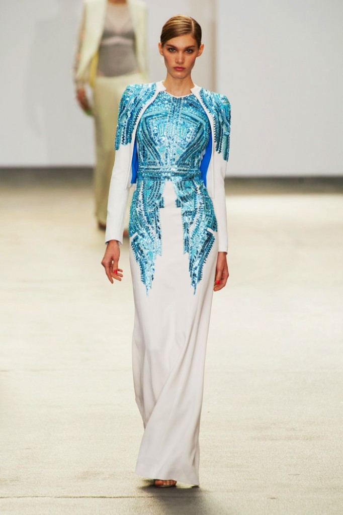 Vô số sợi kim tuyến mang lại độ óng ánh cho thiết kế này của Mary Katranzou.
