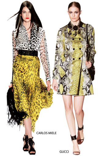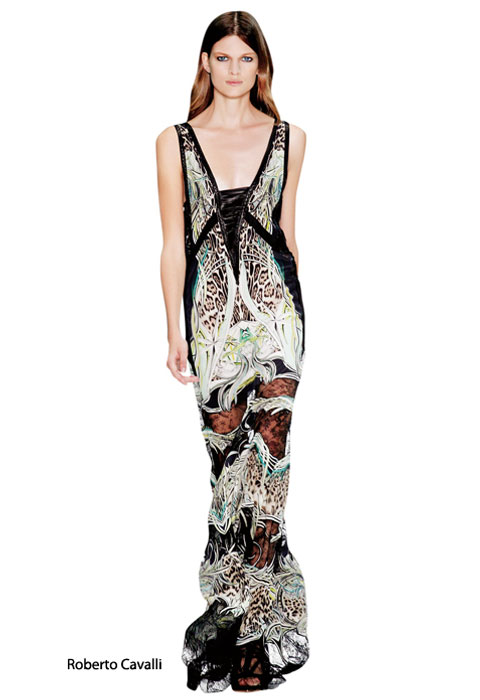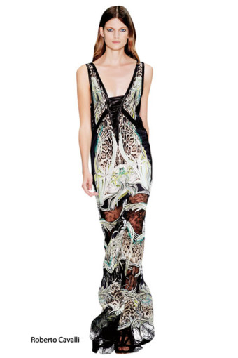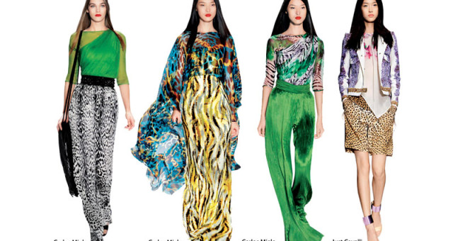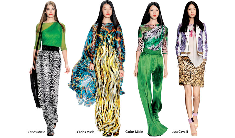 Báo và bò sát được Max Mara, Roberto Cavalli (ảnh), Just Cavalli khắc họa gắn chặt với môi trường rừng xanh khi thiết kế các màu in xen lẫn họa tiết động vật và cây cối rậm rạp hoặc những trảng hoa đầy màu sắc.