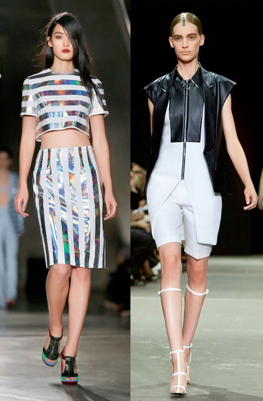 Gắn với dòng trang phục này thường là chất liệu cotton thoáng mát nhưng mùa này còn có cả ren mỏng nhẹ, chiffon, vải phủ ánh kim, da và plastic. Điểm chung là các nhà thiết kế đều dùng những đường bo, mảng thẳng để biến tấu.