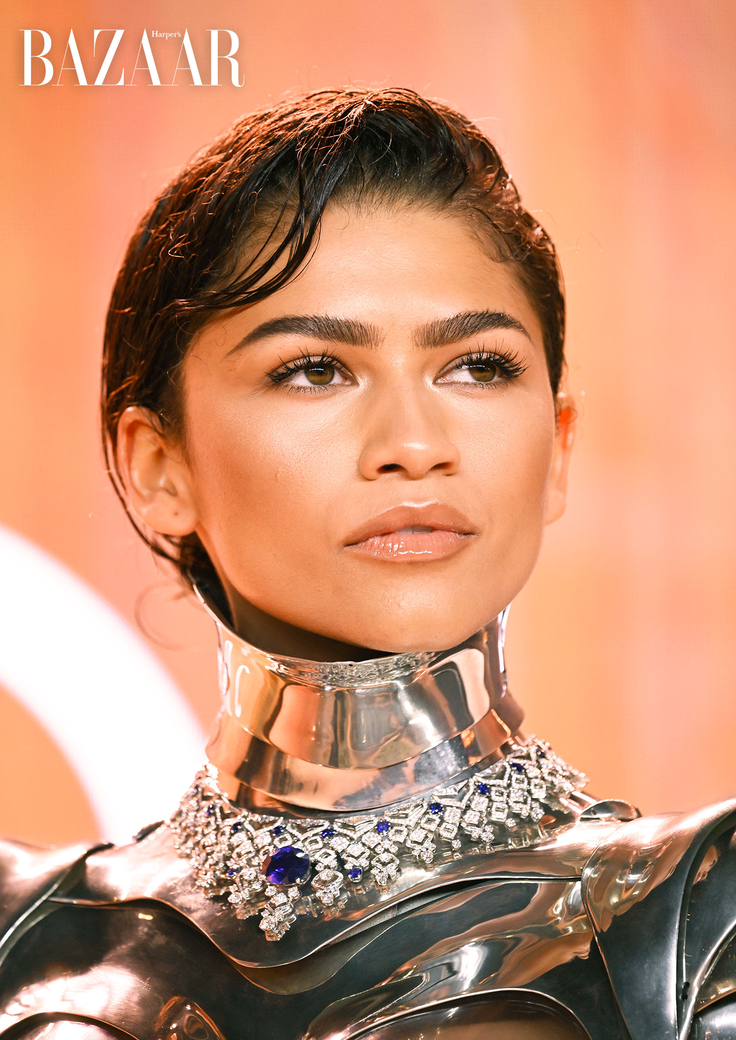 Khoác trên mình bộ giáp nửa kín, nửa hở, Zendaya đã khéo léo kết hợp với kiểu tóc búi gọn gàng và vòng cổ từ Bulgari. Món trang sức đến từ BST đỉnh sức (high jewelry) được làm bằng bạch kim và kim cương, có tâm điểm là viên sapphire nặng 28,11 carat ở chính giữa, khiến Zendaya trông như một nữ anh hùng cao quý.