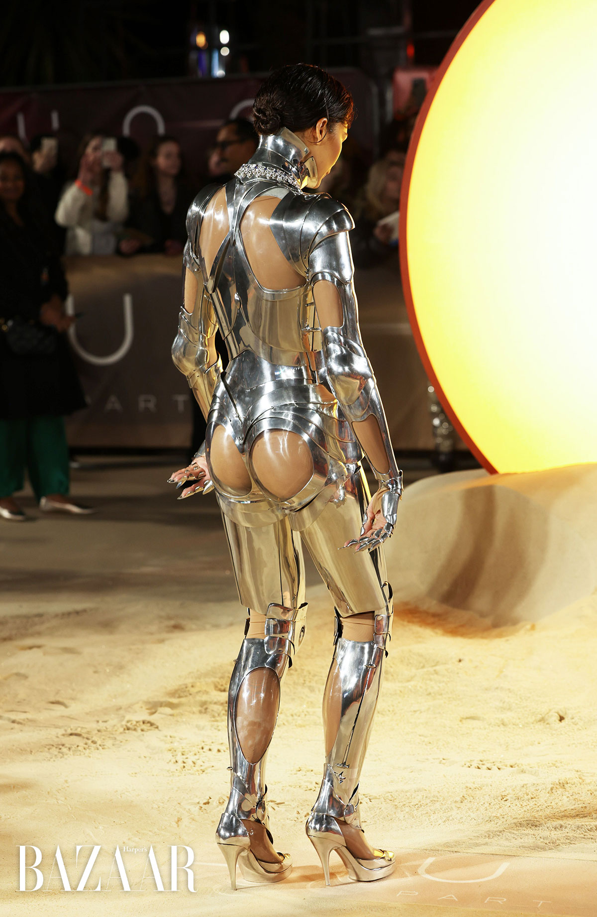 Bộ áo giáp bạc mà Zendaya mặc là một trong những tác phẩm mang tính biểu tượng nhất của nhà thiết kế Thierry Mugler, được trưng bày trong buổi trình diễn thời trang cao cấp kỷ niệm 20 năm của ông vào năm 1995.