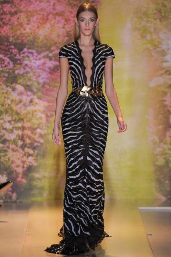 Bộ sưu tập của Zuhair Murad như một vườn hoa di động với 25.000 bông hoa vải mô phỏng hoa trà, hoa hồng, mẫu đơn… đính khéo léo trên bộ trang phục. Để cân bằng hình ảnh hoa cỏ mùa xuân, ông thêm vào các chi tiết mang hơi thở động vật như họa tiết ngựa vằn, vải in da báo và lông vũ.